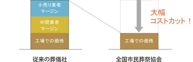 従来の葬儀社では、仕入れ業者から生産工場までの仕入れルートが長く、中間マージンが多く かかっていました。そこで、越谷市民葬祭・草加市民葬祭・春日部市民葬祭では、全国展開の強みを活かし、生産工場から全国一括で買い付けることにより大幅にコストカットに成功しました。